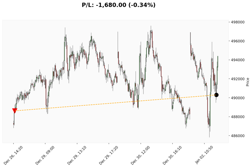 📊 Trade de VENDA em BIT.✔ Entrada: 488620.00 (26/12/2025)✔ Saída: 490300.00 (02/01/2026)💰 P/L: -1680.00 (-0.34%)⏳ Duração do trade: 6 dia(s)