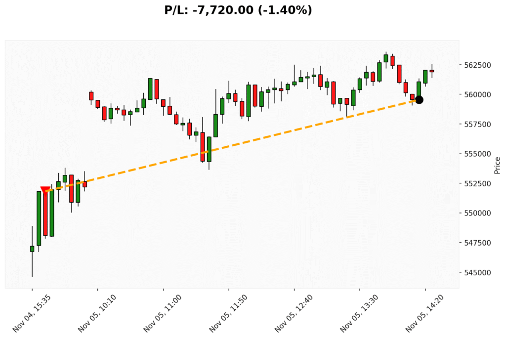📊 Trade de VENDA em BIT. ✔ Entrada: 551820.00 (04/11/2025)✔ Saída: 559540.00 (05/11/2025)💰 P/L: -7720.00 (-1.40%) ⏳ Duração do trade:...