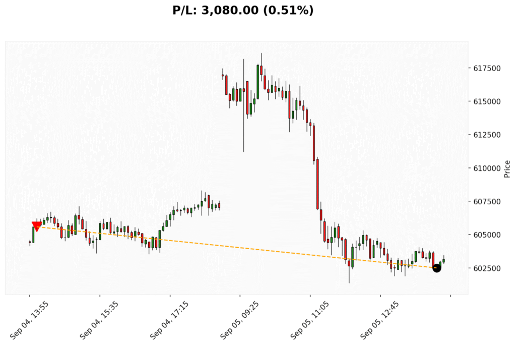 📊 Trade de VENDA em BIT. ✔ Entrada: 605580.00 (04/09/2025)✔ Saída: 602500.00 (05/09/2025)💰 P/L: 3080.00 (0.51%) ⏳ Duração do trade:...