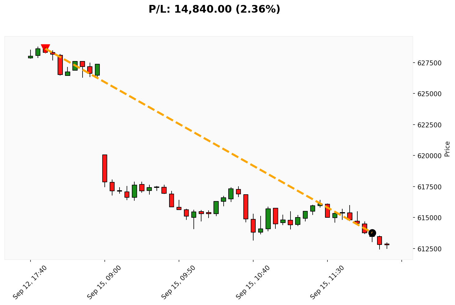 📊 Trade de VENDA em BIT. ✔ Entrada: 628620.00 (12/09/2025)✔ Saída: 613780.00 (15/09/2025)💰 P/L: 14840.00 (2.36%) ⏳ Duração do trade: 2 dia(s)