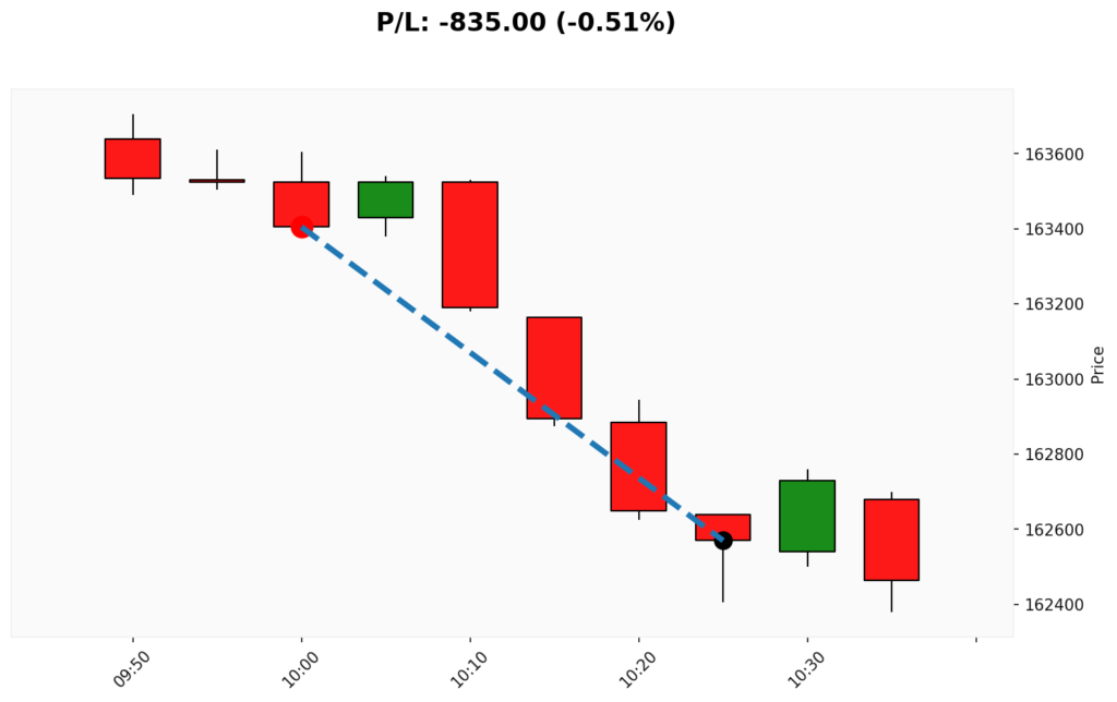 📊 📈 COMPRA em WIN. ✔ Entrada: 163405.00 (01/12/2025 10:00)✔ Saída: 162570.00 (01/12/2025 10:25)💰 P/L: -835.00 ⏳ Duração: 0.4 hora(s)